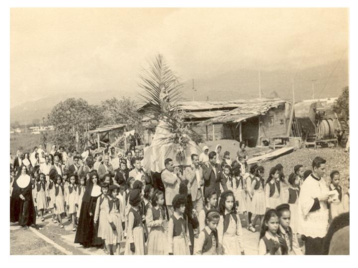 Procesión de la Virgen. La acompañan las alumnas y docentes del Colegio San José Siervas del Santísimo en el barrio Colseguros. Santiago de Cali, 01-07-1963.