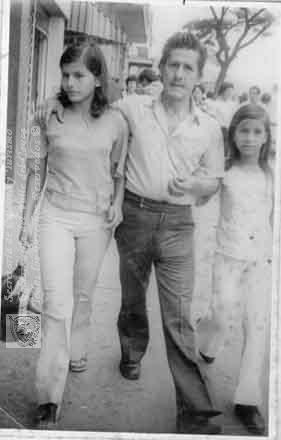 Martha y Sandra Peláez junto a su padre, caminan por una calle del Barrio San Nicolás. Cali. 1976.