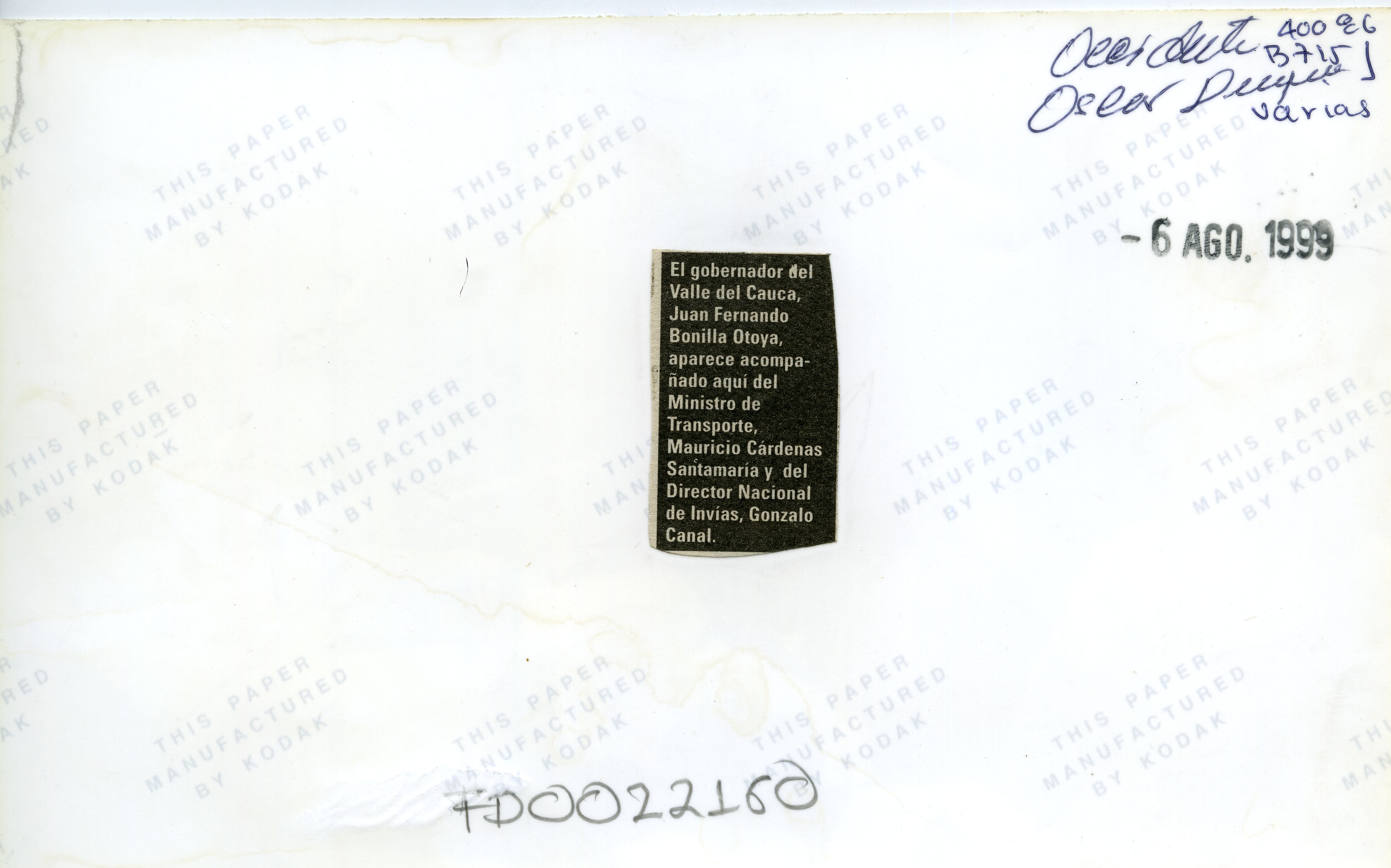 Al reverso de la fotografía se anexa recorte:" El gobernador del Valla del Cauca, Juan Fernando Bonilla Otoya, aparece acompañado aquí del ministro de transporte, Mauricio Cárdenas Santamaria y del director general de invias, Gonzalo Canal