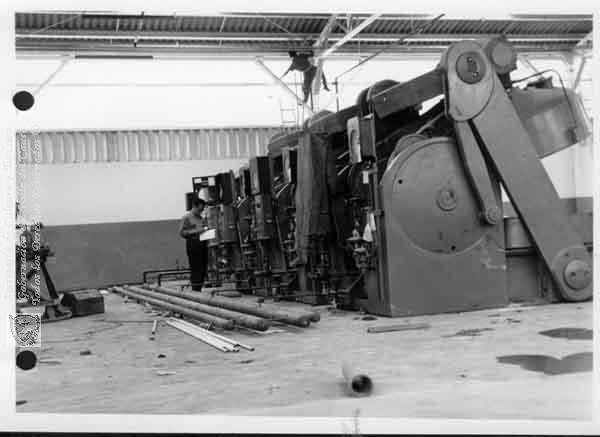 LOOKING WEST AT "75" AND "65" VULCANIZERS.Maquinaria de la empresa Good Year.