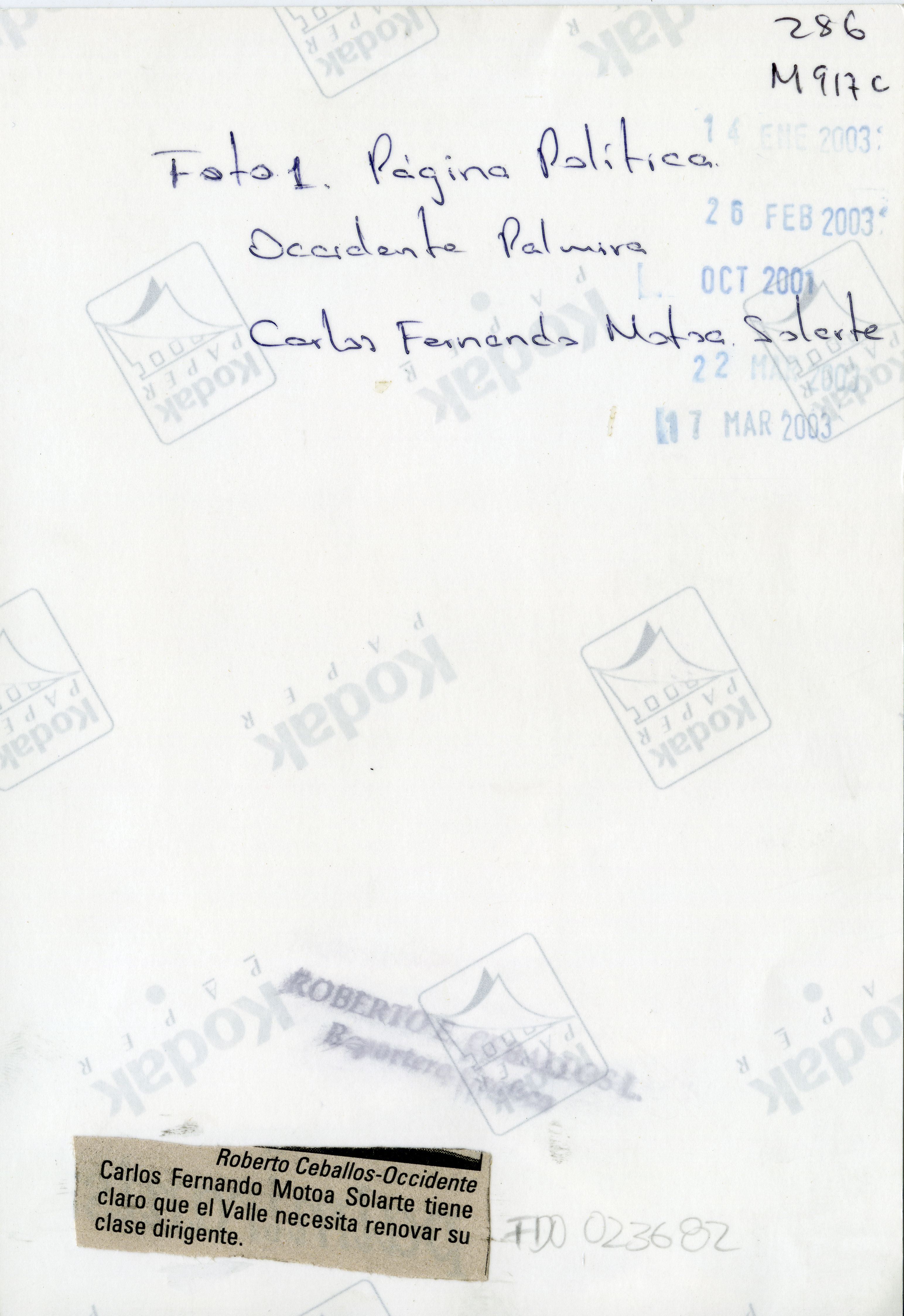 Al reverso de la fotografía se anexa recorte: Carlos Fernando Motoa Solarte, tiene claro que el Valle necesita renovar su clase dirigente