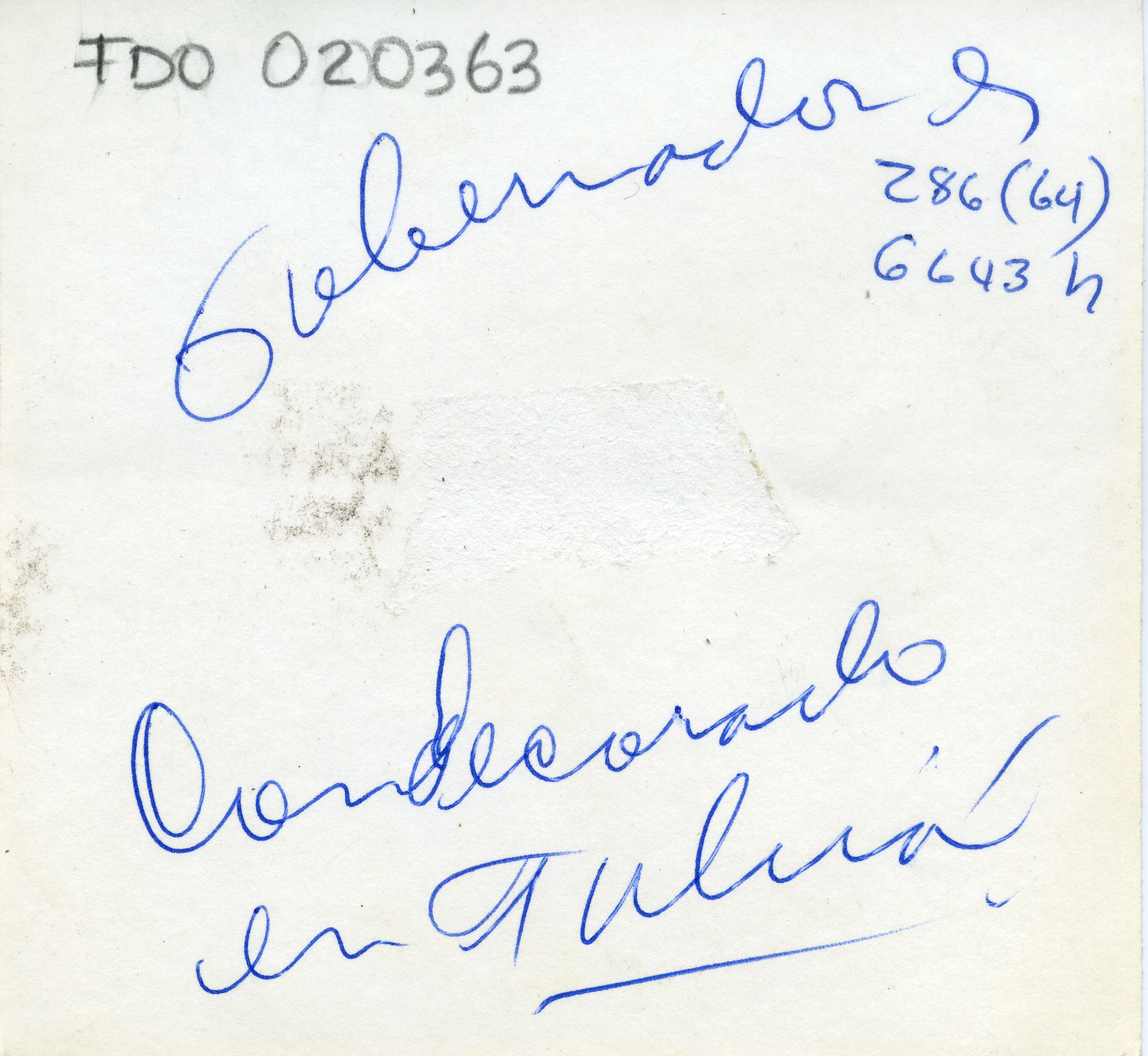 Fotografia de plano medio largo de Humberto Gonzalez Narvaez, donde se ve sentado al pie de un escritorio, esta vestido de saco y corbata, junto a él hay otra persona de pie, la cual tiene las dos manos juntas, en la parte interior de ellos se puede ver claramente un cuadro que con un escudo, y una bandera