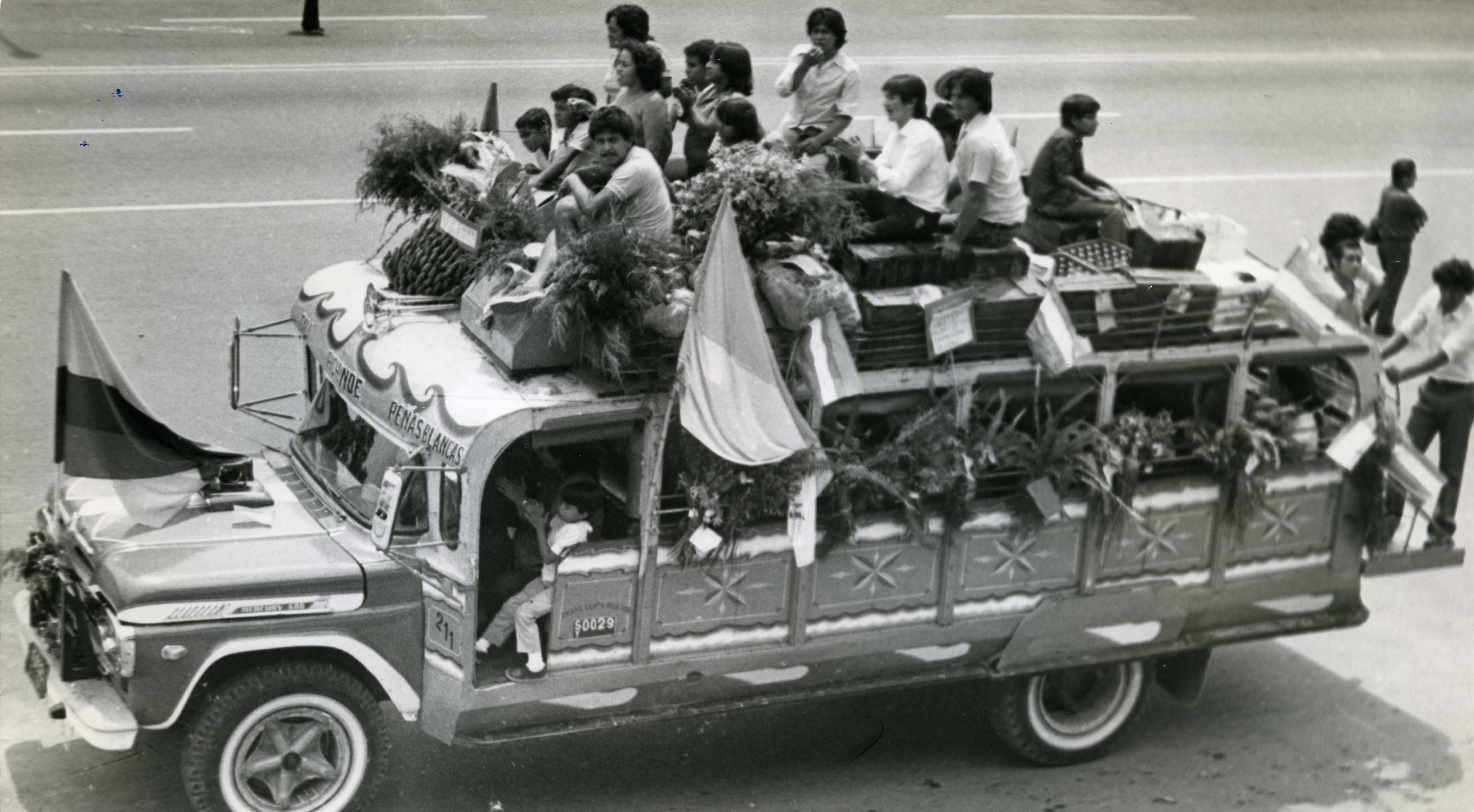 En esta fotografía se puede observar una chiva (transporte) transitando en las calles de la ciudad de Cali, podemos ver que la chiva en su parte superior lleva personas y algunas pertenencias de las personas que utilizan este medio de trasporte. // El Archivo del Patrimonio Fotográfico y Fílmico del Valle del Cauca es responsabilidad de la Biblioteca Departamental del Valle Jorge Garcés Borrero, por convenio de cooperación suscrito con la Secretaria del Cultura Departamental, con el fin de aunar esfuerzos para su conservación, preservación y divulgación del Archivo entre la comunidad Vallecaucana, especialmente entre los estudiantes e investigadores que visitan la Biblioteca, propiciando el su uso y consulta permanente. La universidad Icesi es un colaborador en el proceso de difusión, facilitando la tecnología que permite la consulta de las imágenes.