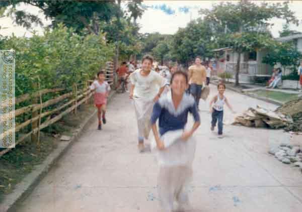 "La carrera de encostaldos" es uno de los juegos tradicionales más acostumbrados en los eventos recreativos y en las festividades y ferias de nuestros pueblos. Zarzal, 1990.