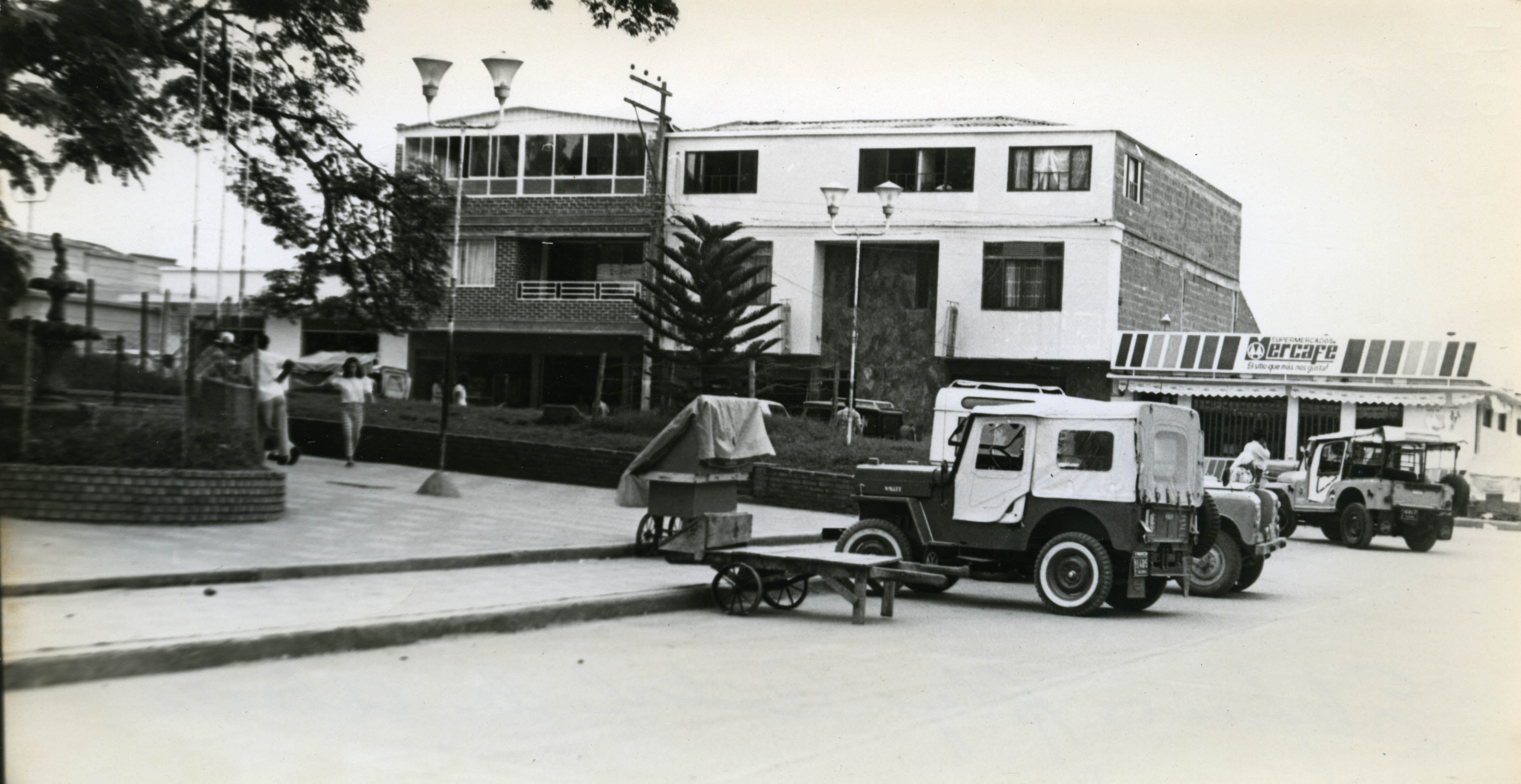 En esta fotografía podemos observar la plaza central del Municipio de Alcalá donde se ven algunos vehículos estacionados sobre la calle //El Archivo del Patrimonio Fotográfico y Fílmico del Valle del Cauca es responsabilidad de la Biblioteca Departamental del Valle Jorge Garcés Borrero, por convenio de cooperación suscrito con la Secretaria del Cultura Departamental, con el fin de aunar esfuerzos para su conservación, preservación y divulgación del Archivo entre la comunidad Vallecaucana, especialmente entre los estudiantes e investigadores que visitan la Biblioteca, propiciando el su uso y consulta permanente. La universidad Icesi es un colaborador en el proceso de difusión, facilitando la tecnología que permite la consulta de las imágenes.