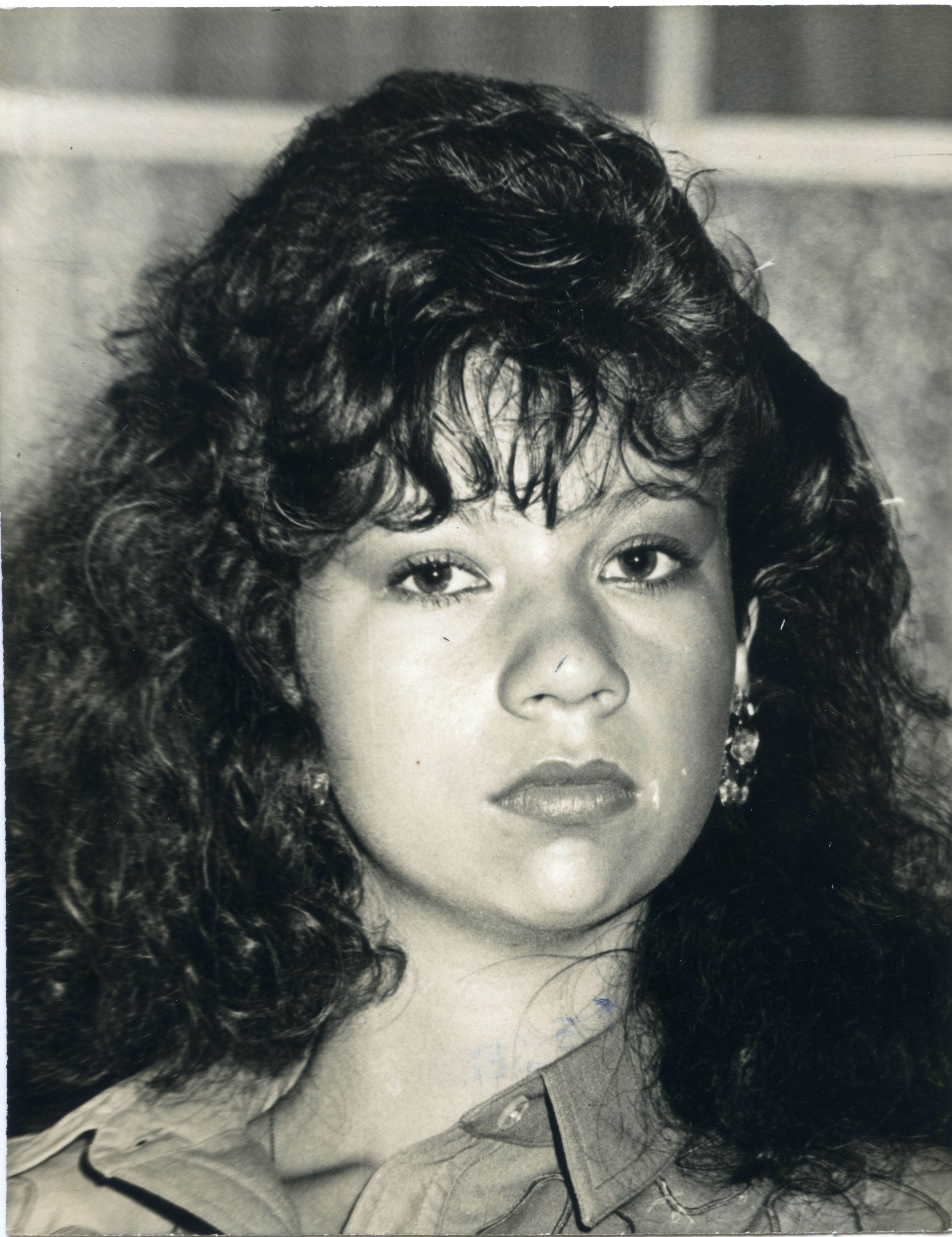 Foto de plano medio corto de Claudia Milena Álvarez, donde se observa a la persona con el cabello largo, luce unos aretes largos de piedra, tiene mirada de medio lado, la fotografía presenta rayón a la altura de la nariz de la persona que aparece en la imagen.