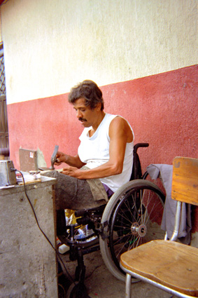 Plano Medio. En la imagen se observa un hombre en silla de ruedas ejerciendo el oficio de la zapatería. Hay algunas herramientas de trabajo en el suelo y sobre la mesa y una silla en la esquina derecha inferior. En la parte de atrás un muro con un zócalo de color rojo definen el espacio de trabajo.