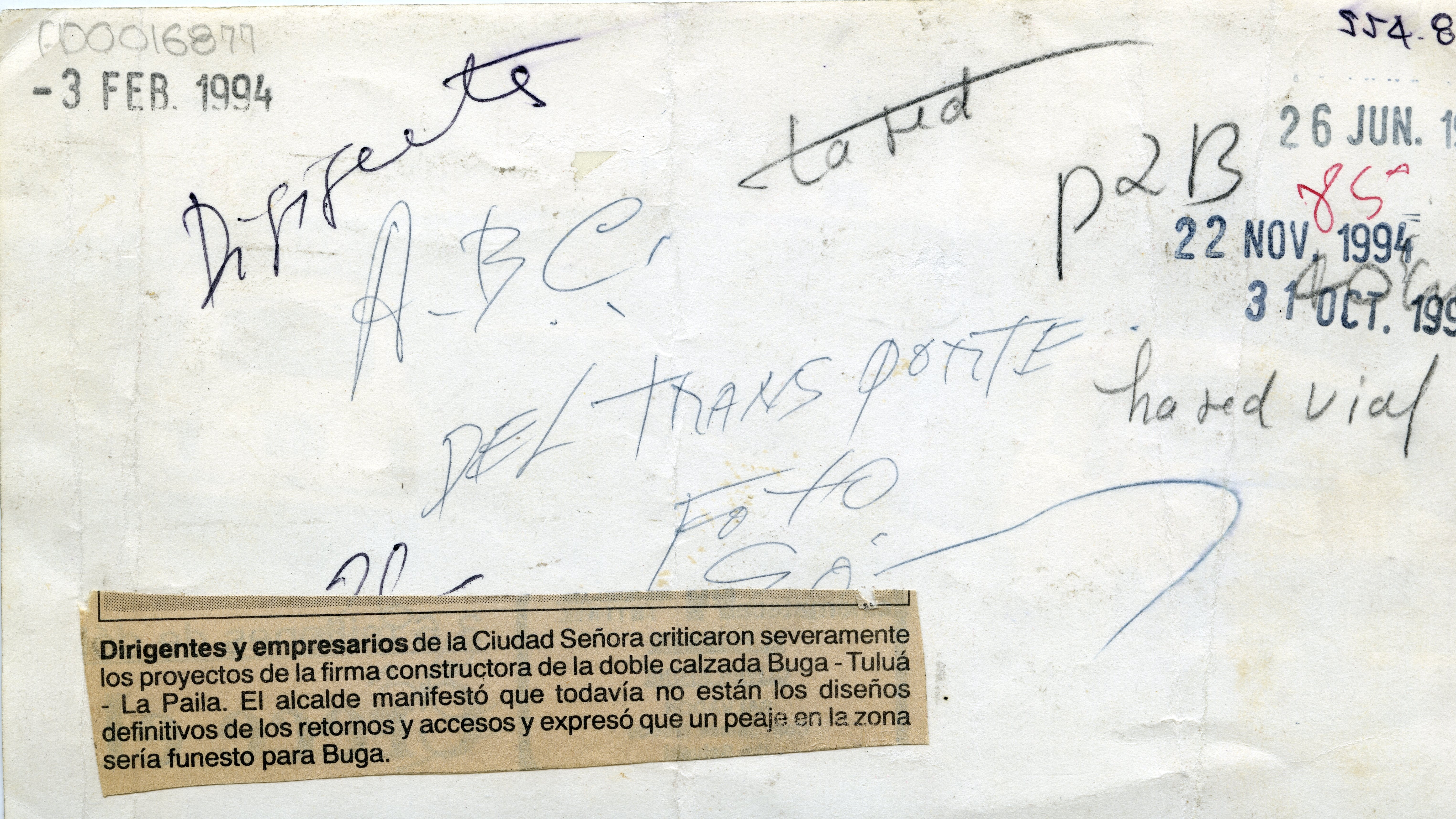 Al reverso de la fotografía se anexa recorte de prensa: "Dirigentes y empresarios de la Ciudad Señora criticaron severamente los proyectos de la firma constructora de la doble calzada Buga-Tuluá-La Paila. El alcalde manifestó que todavía no están los diseños definitivos de los retornos y accesos y expresó que un peaje en la zona sería funesto para Buga."