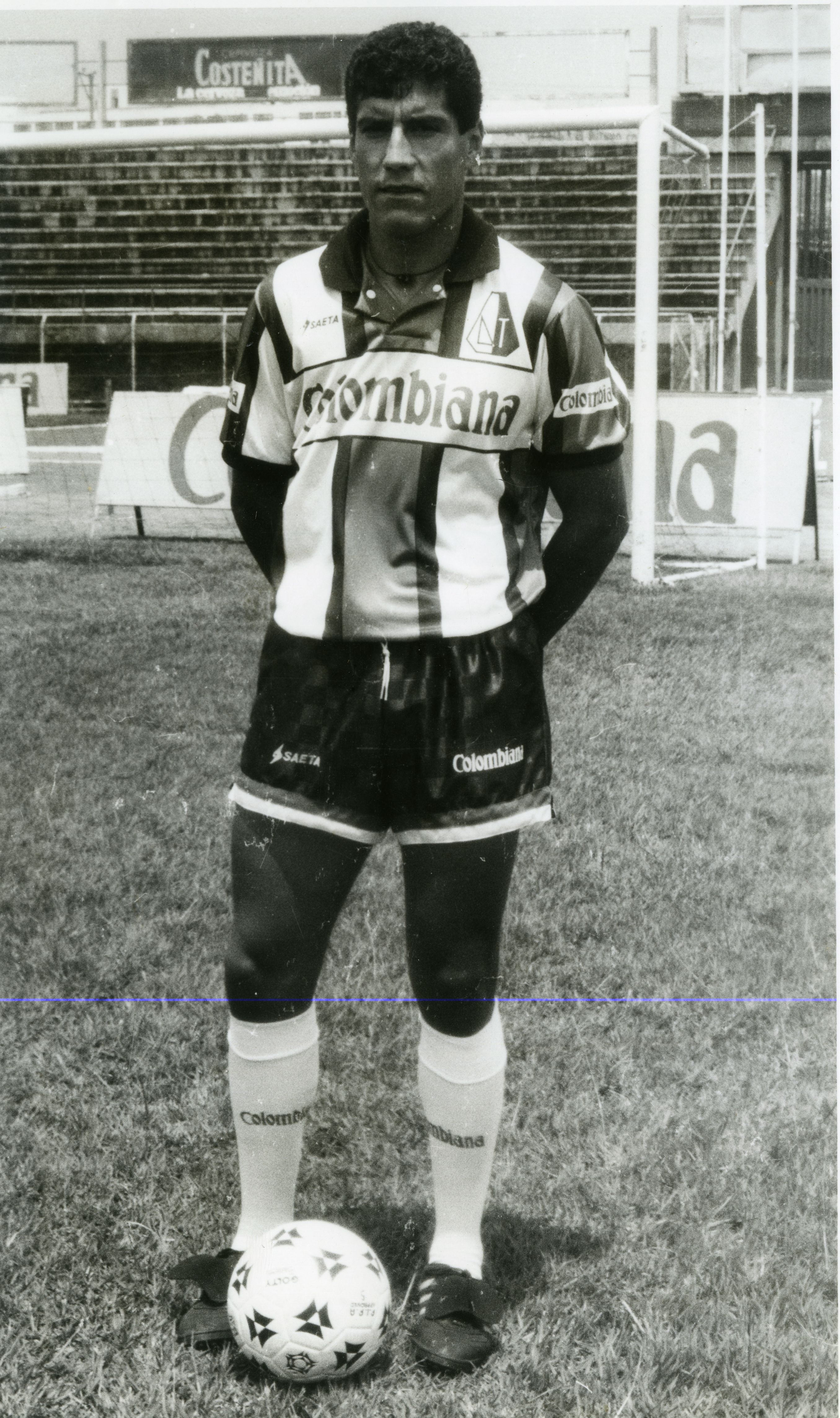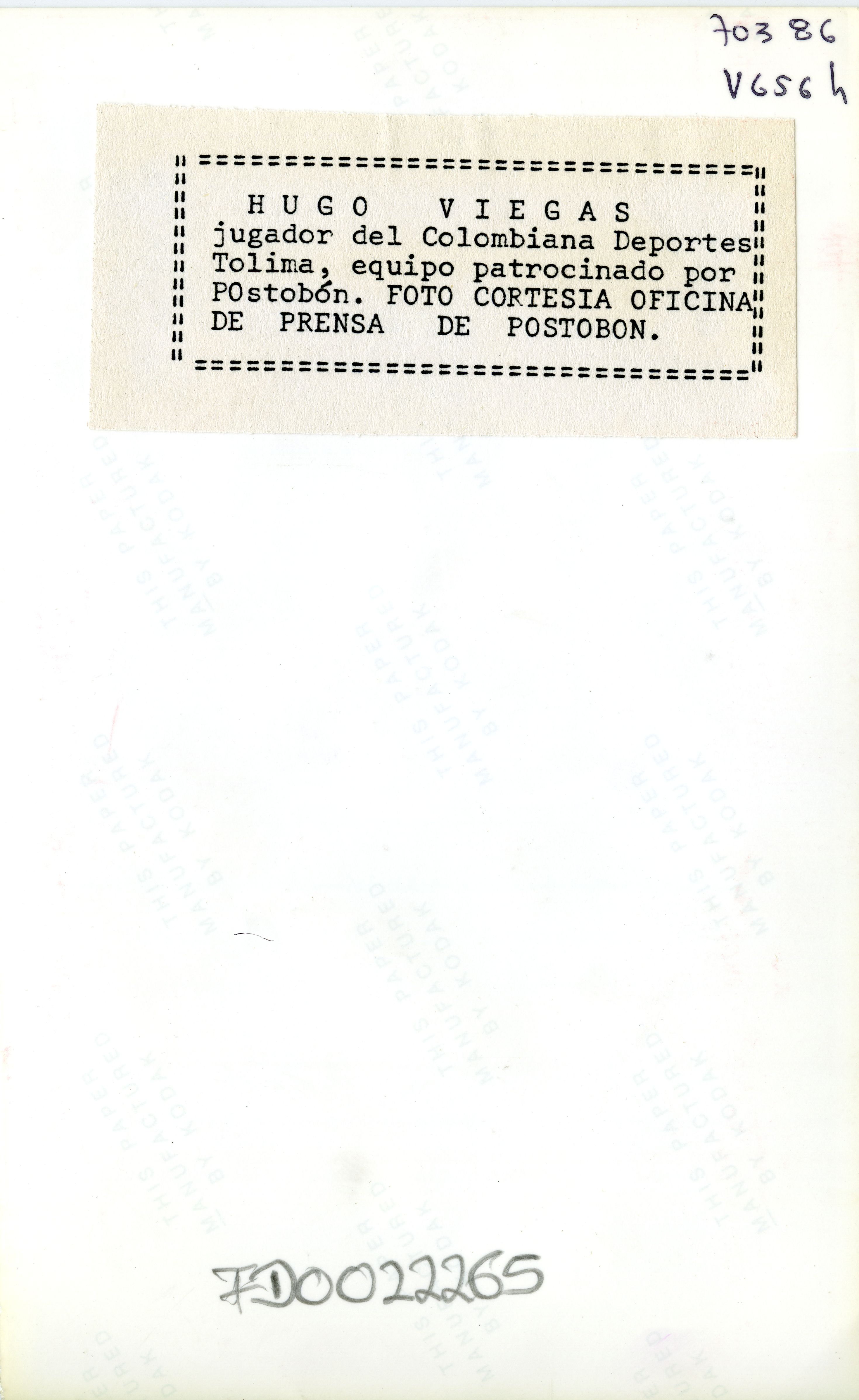 En la fotografía podemos observar al jugador de fútbol Hugo Viegas, perteneciente al equipo Deportes Tolima. Al reverso de la fotografía se anexa nota escrita: "Hugo Viegas jugador del Colombiana Deportes Tolima, equipo patrocinado Postobón. Foto cortesía oficina de Prensa de Postobón."