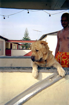 Plano medio. Perro en punto focal. Sujeto en costado derecho. Línea como eje compositivo.