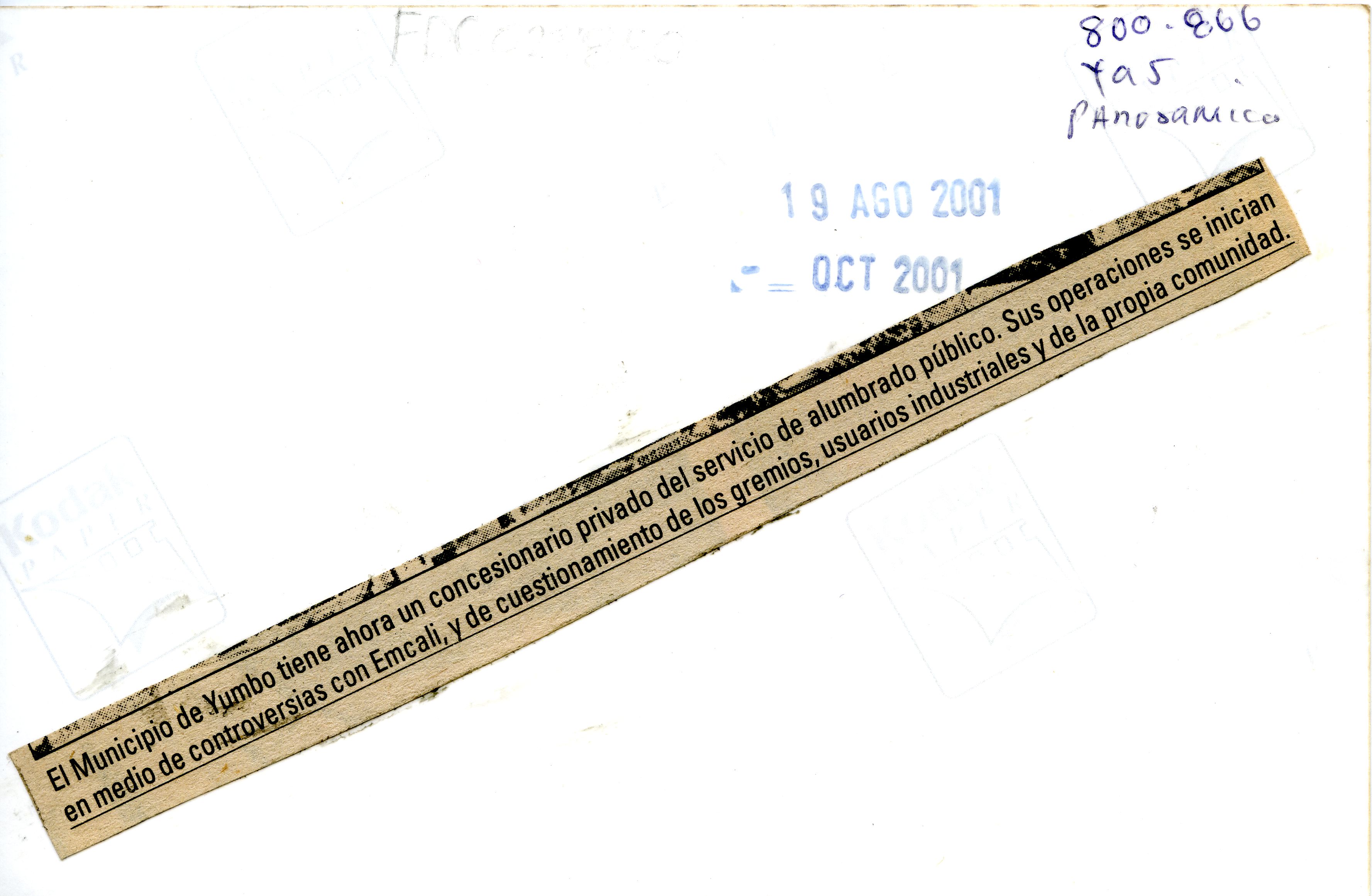 Reverso:"El Municipio de Yumbo tiene ahora un concesionario privado del servicio de alumbrados públicos.Sus operaciones se inician en medio de controversias con Emcali, y de cuestionamiento de los gremios, usuarios industriales y de la propia comunidad."