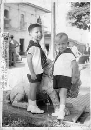 Los hermanos Rojas juegan y posan frente a la escultura del león y el niño ubicada en el parque central. Roldanillo. C. 1965.