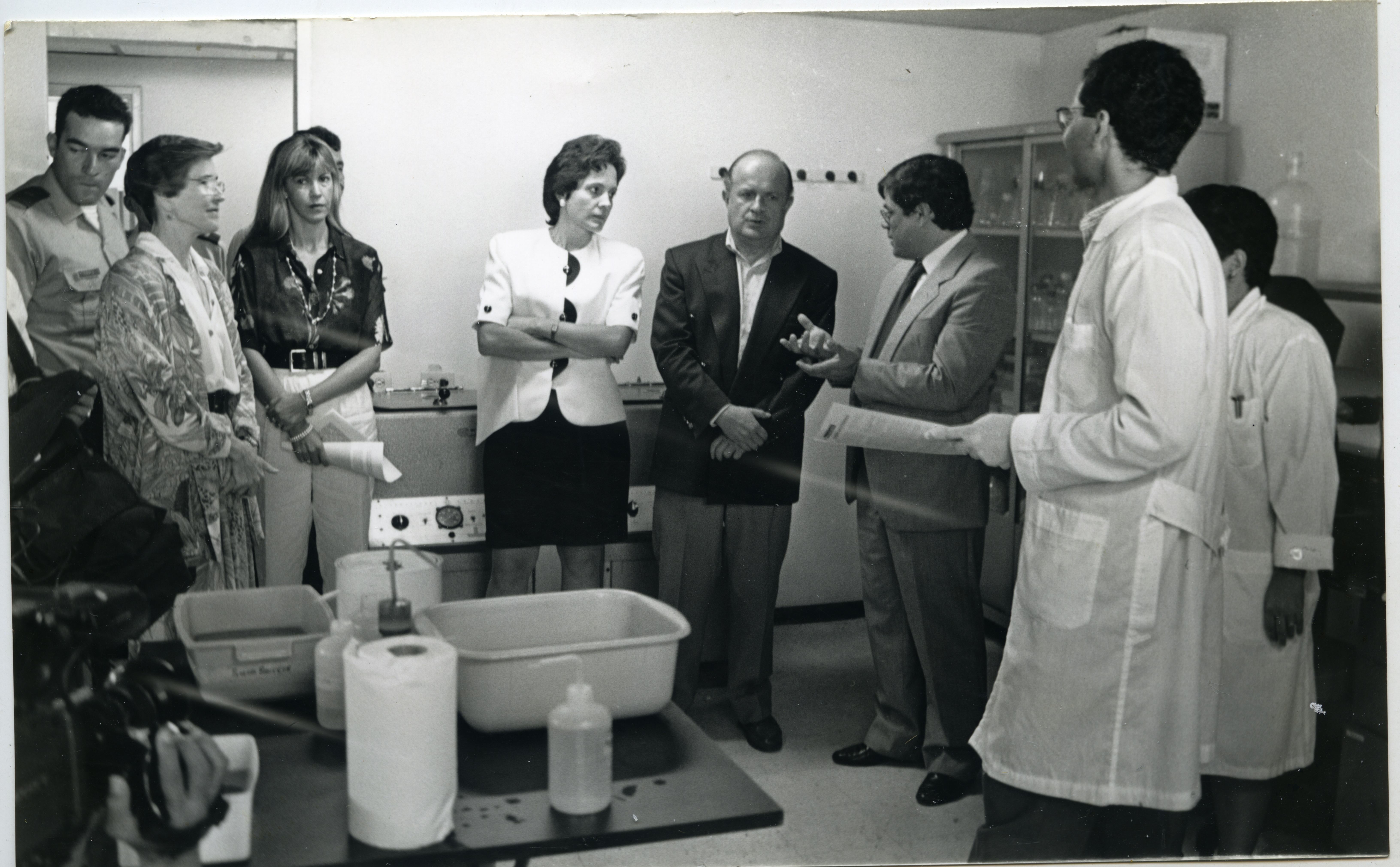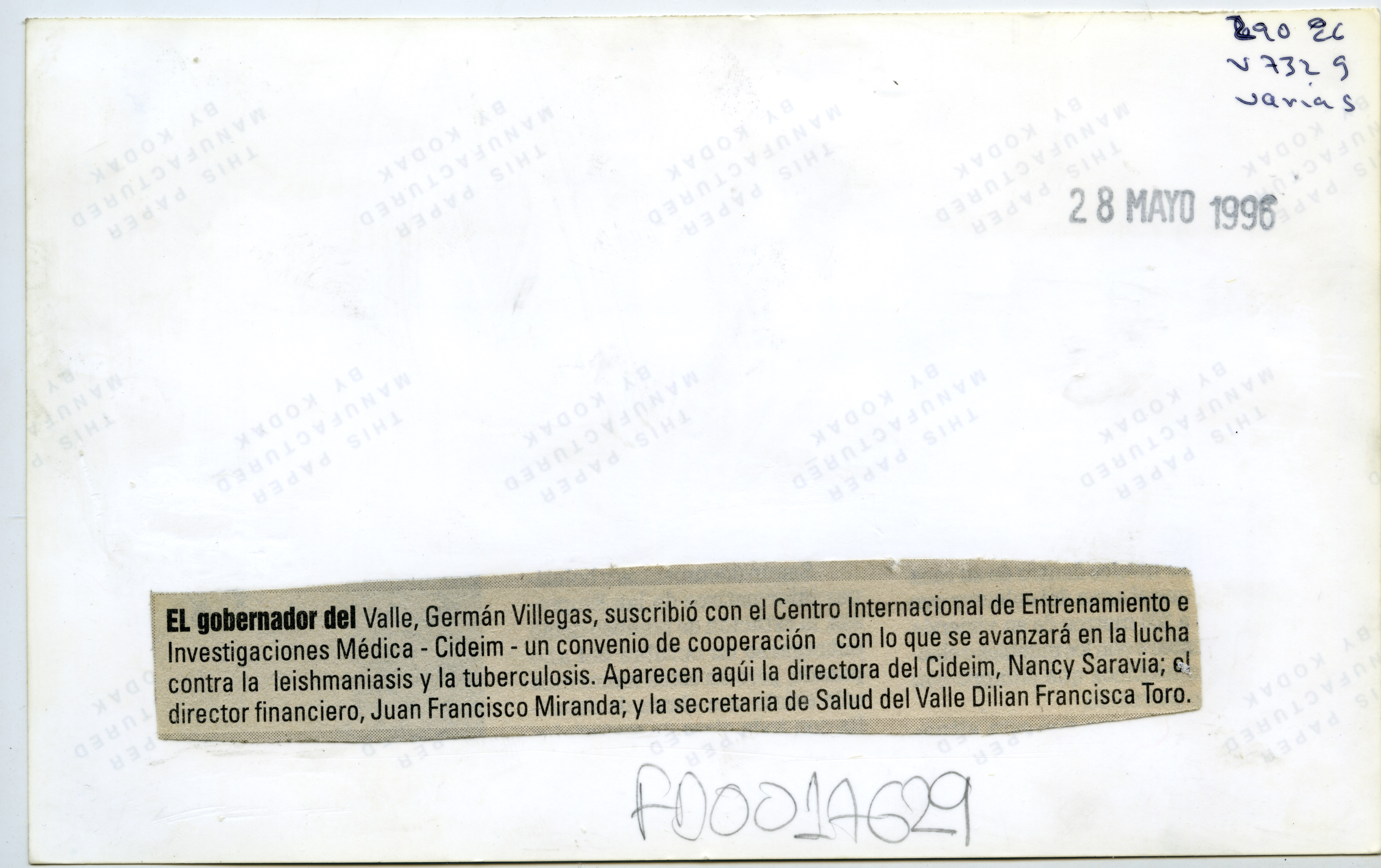 Al reverso de la fotografía se anexa recorte: " El gobernador del Valle, Germán Villegas Villegas, suscribió con el centro internacional de entrenamiento e investigación médica- Cideim- un convenio de cooperación con lo que se avanzará en la lucha contra la leishmaniasis y la tuberculosis. Aparecen aquí la directora del Cideim, Nancy Saravia; el director financiero, Juan Francisco Miranda; y la secretaria de Salud del Valle Dilian Francisca Toro."