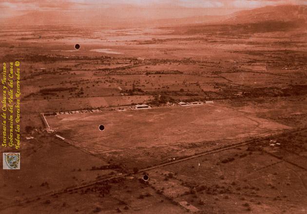 Primeras instalaciones de la Escuela Militar de Aviación, en los barrios La Base y Villa Colombia. La Floresta no estaba urbanizada. Al fondo se aprecian las lagunas de Aguablanca. Cali, 1935.