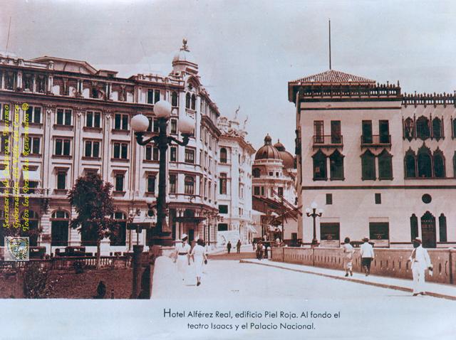 HOTEL ALFÉREZ REAL, EDIFICIO PIELROJA, al fondo EL TEATRO JORGE ISAACS Y EL PALACIO NACIONAL. Santiago de Cali, C. 1935