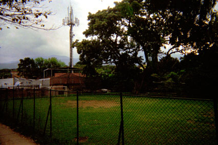 Plano general. Imagen tomada en exterior, donde se observa una cancha de fútbol cercada por malla. Al fondo se destaca un árbol frondoso entre la vegetación.