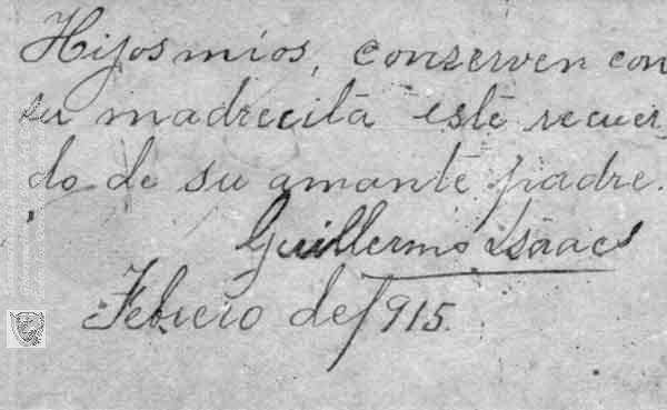 Dedicatoria que dejo Guillermo Isaacs a sus hijos y esposa. Cali. 1915.