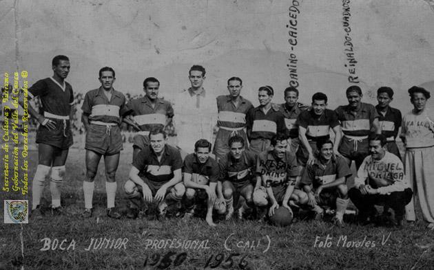 Equipo de fútbol Boca Juniors Profesional . Se distingue entre otros a "Canino" Caicedo quien integró la Selección Valle y posteriormente la Selección Colombia . Cali, 1949.