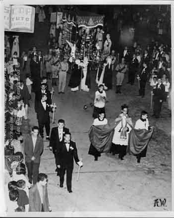 Obsérvese todo el rigor en las prendas de vestir de los asistentes a la muy tradicional semana santa sevillana, en el Valle. 1957.