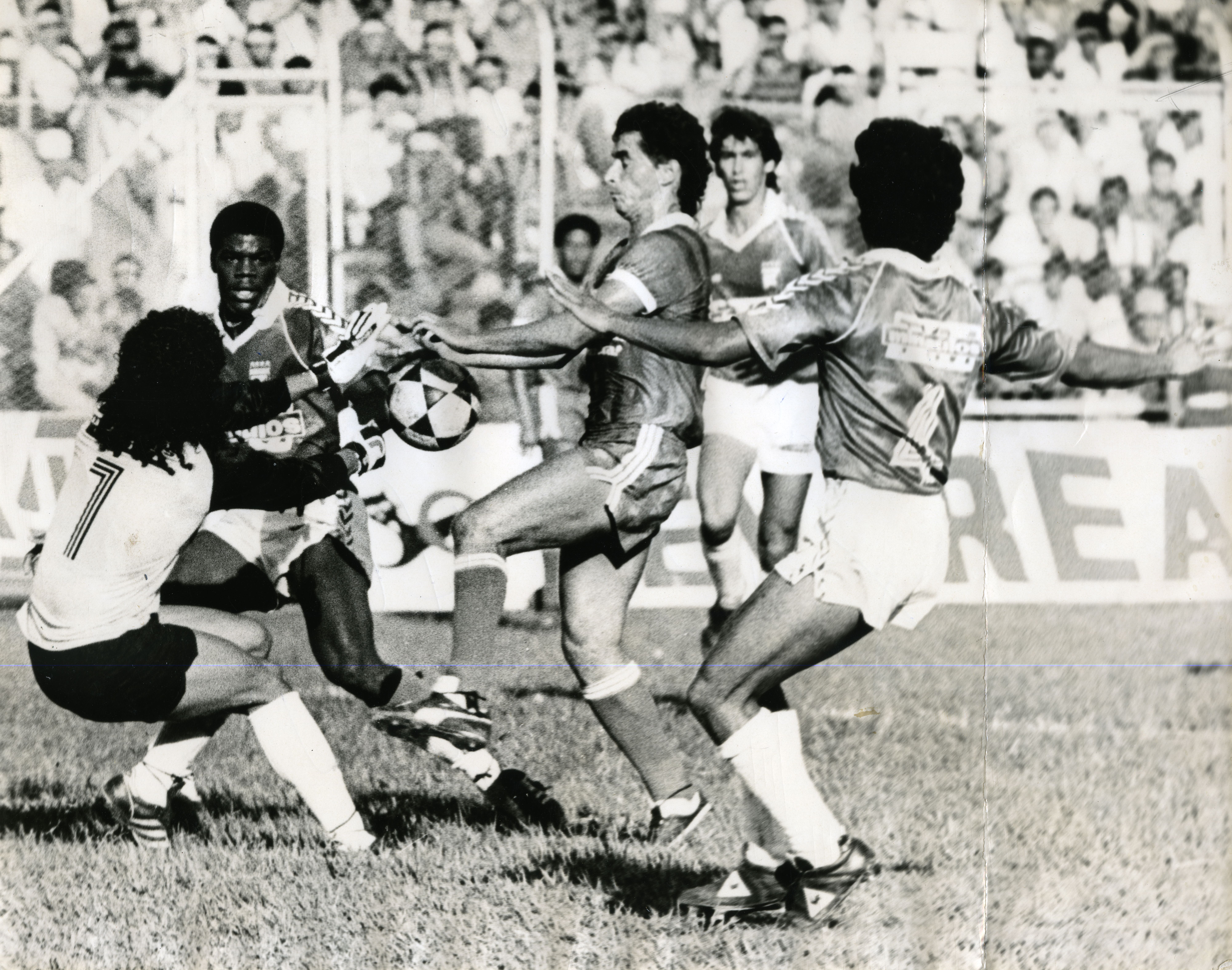 Partido de fútbol América de Cali vs Nacional en el estadio Pascual Guerrero. Se aprecia acciones del partido y los jugadores Luis Carlos Perea, Rene Iguita, Andrés Escobar, entre otros.