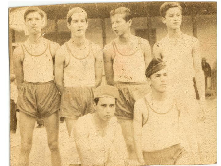 Guillermo López,Antonio Giraldo y otros integrantes,por identificar, del equipo de Baloncesto.Versalles,06-01-1953