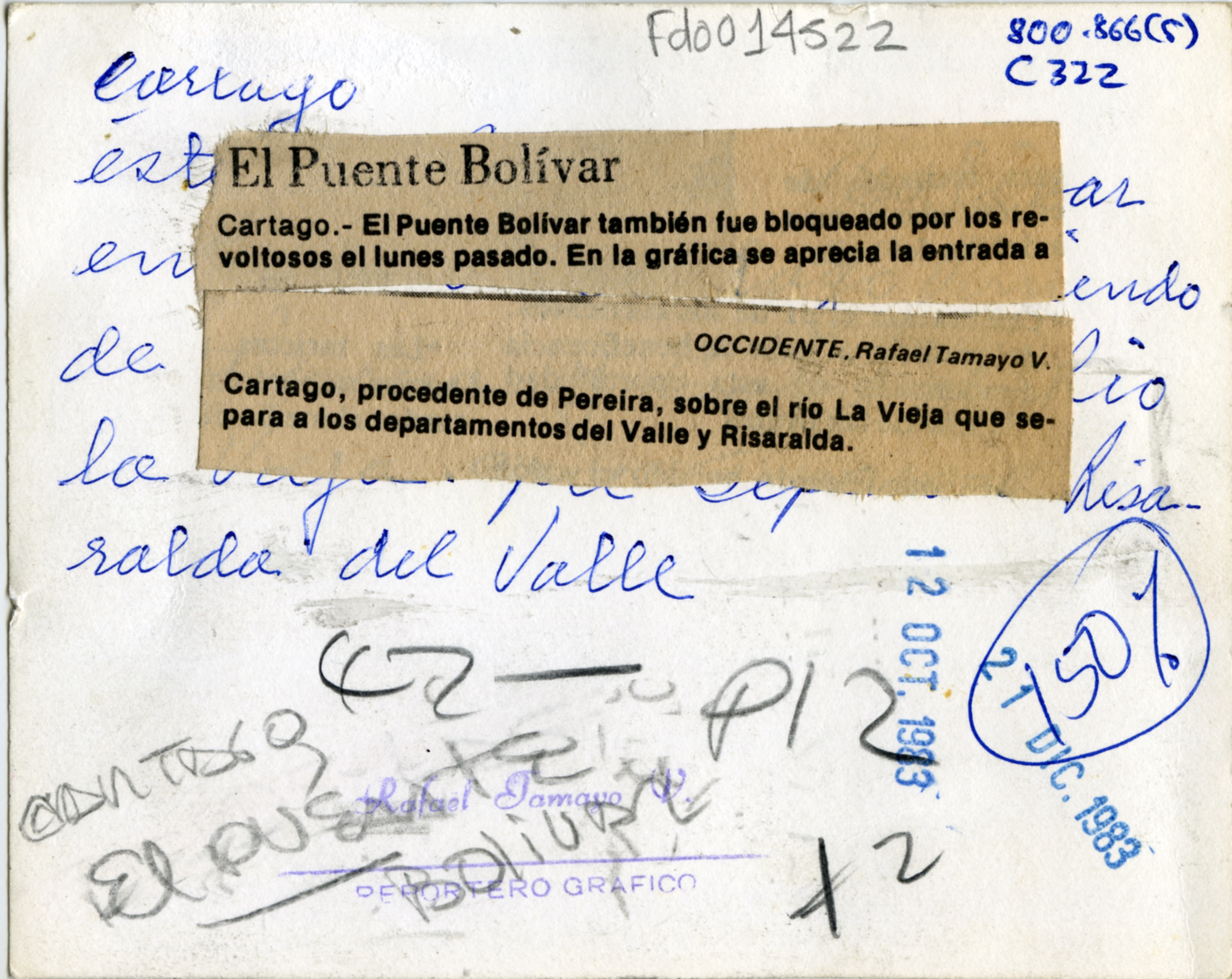 | dc.description.abstract | Puente Bolívar Cartago-Pereira bloqueado con escombros y llantas. Al reverso de la fotografía se anexa recorte: "El puente Bolívar. El puente de Bolívar también fue bloqueado por los revoltosos el lunes pasado. En la gráfica se aprecia la entrada a Cartago, procedente de Pereira, sobre el río La Vieja que separa a los departamentos del Valle y Risaralda." | spa |