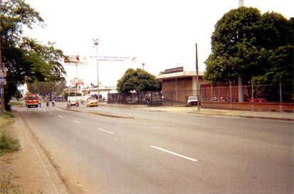 Primer plano. Calle con autos en movimiento. Calle en sentido transversal. Perspectiva lineal. Sobredimensión de calle por enfoque.