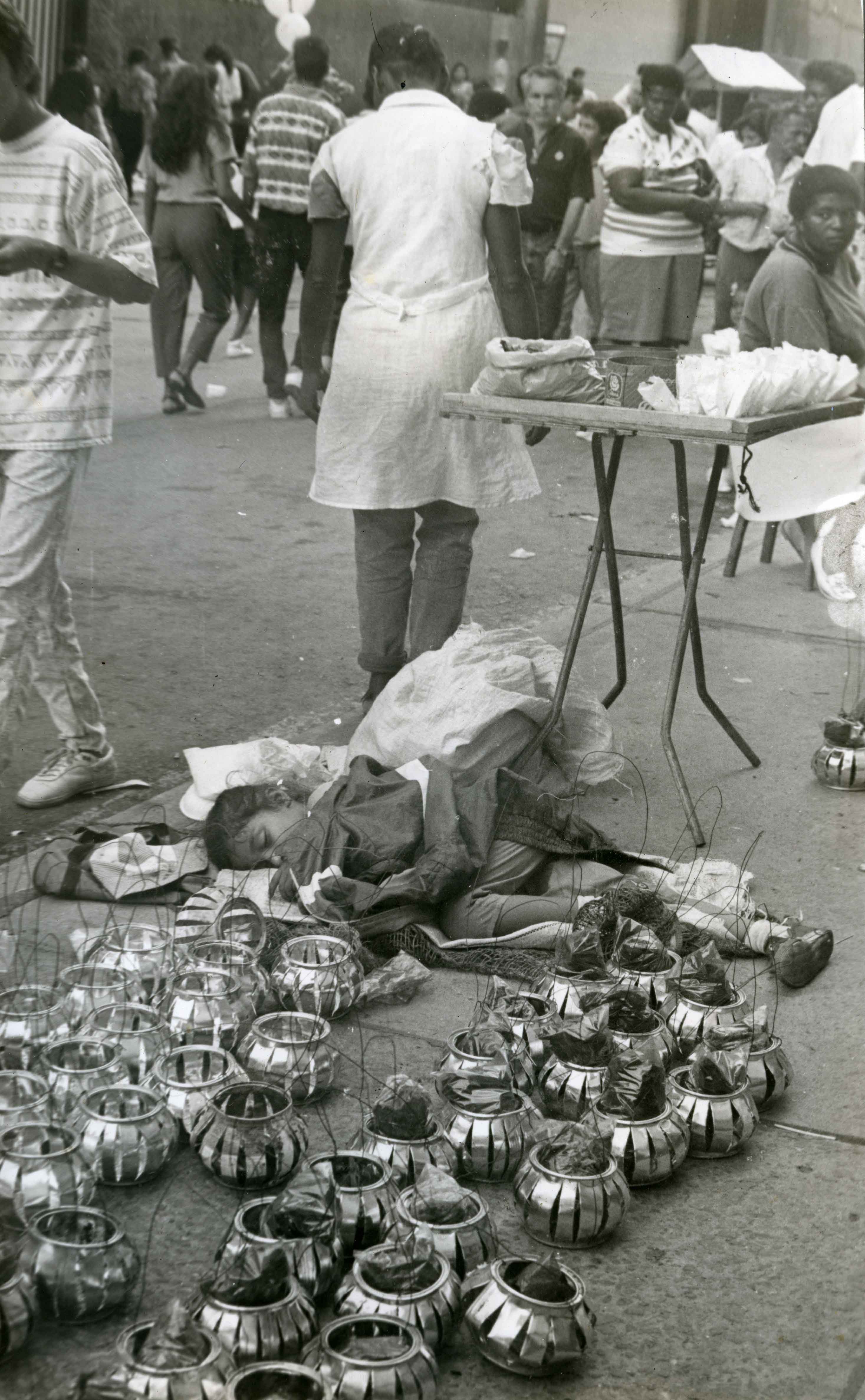 Niña dormida en medio de recipientes llenos de sahumerio a la venta en Semana Santa en Santiago de Cali >El Archivo del Patrimonio Fotográfico y Fílmico del Valle del Cauca es responsabilidad de la Biblioteca Departamental del Valle Jorge Garcés Borrero, por convenio de cooperación suscrito con la Secretaria del Cultura Departamental, con el fin de aunar esfuerzos para su conservación, preservación y divulgación del Archivo entre la comunidad Vallecaucana, especialmente entre los estudiantes e investigadores que visitan la Biblioteca, propiciando el su uso y consulta permanente. La universidad Icesi es un colaborador en el proceso de difusión, facilitando la tecnología que permite la consulta de las imágenes.
