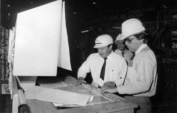 Observando planos en la planta de Propal. Yumbo, C. 1985.