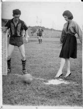 El "saque de honor" le correspondio a Rubiela Cardona, ritual propio de este deporte que se hace para reconocer a una persona en especial que se distingue en la comunidad. Trujillo. C. 1970.