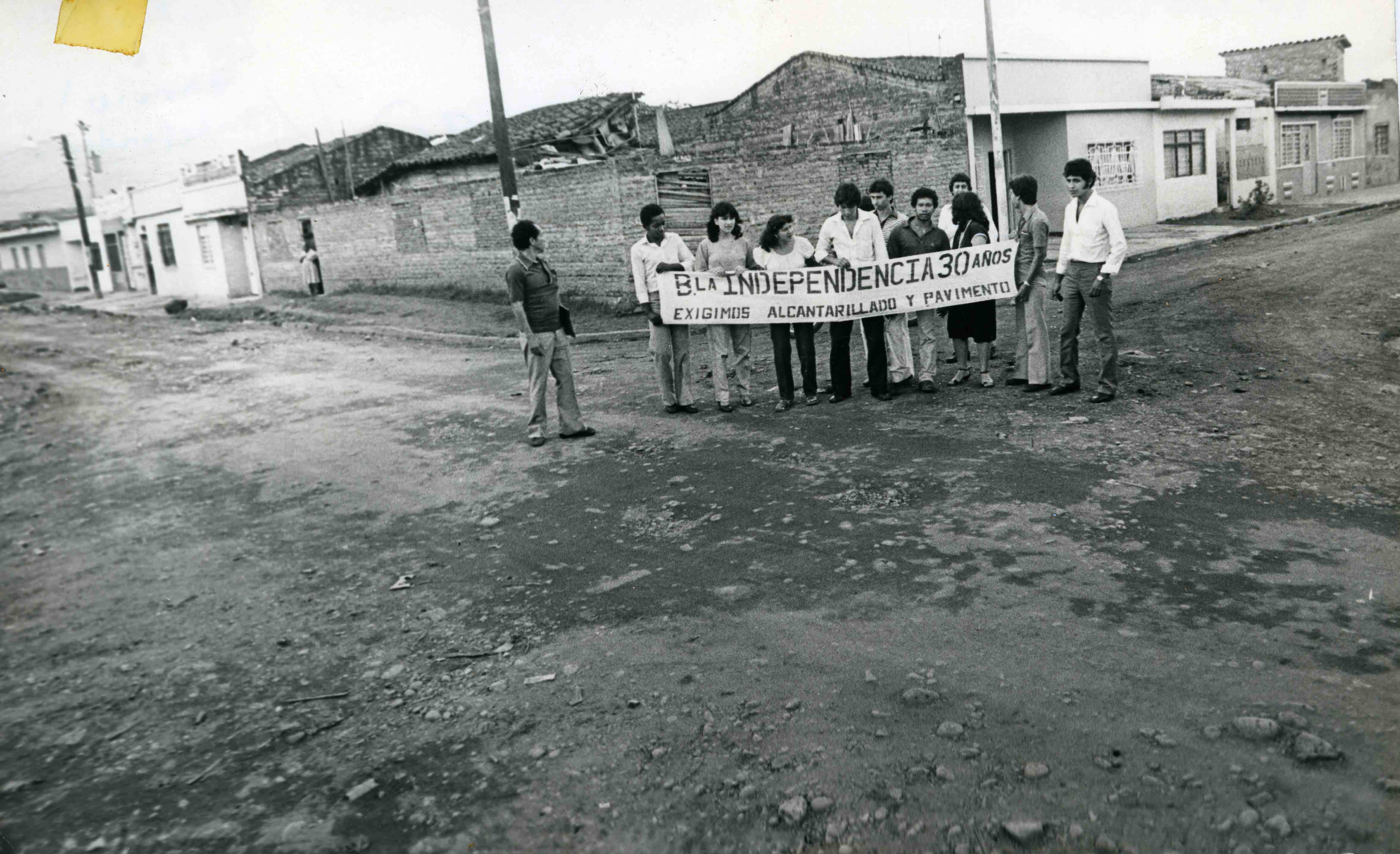 Jóvenes en protesta exigiendo Alcantarillado y Pavimentación de Calles en el Barrio La Independencia, con 30 años en Santiago de Cali >El Archivo del Patrimonio Fotográfico y Fílmico del Valle del Cauca es responsabilidad de la Biblioteca Departamental del Valle Jorge Garcés Borrero, por convenio de cooperación suscrito con la Secretaria del Cultura Departamental, con el fin de aunar esfuerzos para su conservación, preservación y divulgación del Archivo entre la comunidad Vallecaucana, especialmente entre los estudiantes e investigadores que visitan la Biblioteca, propiciando el su uso y consulta permanente. La universidad Icesi es un colaborador en el proceso de difusión, facilitando la tecnología que permite la consulta de las imágenes.