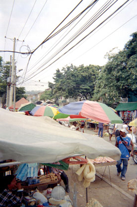 Plano de contexto. Exterior día. Perspectiva de mercado ambulante. Realce de parasoles technicolor. Ciudadanos en escena. Cables eléctricos en sentido diagonal.