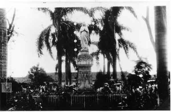 Aunque tradicionalmente las plazoletas han sido lugares para instalar estatuas de personajes políticos y próceres, en Buga la fuerza de la religión instala santos en sus espacios lúdicos.C. 1942