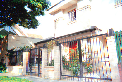 Plano medio. Vivienda de dos niveles con terminación en ladrillo. Rejas exteriores. Vegetación ornamental.