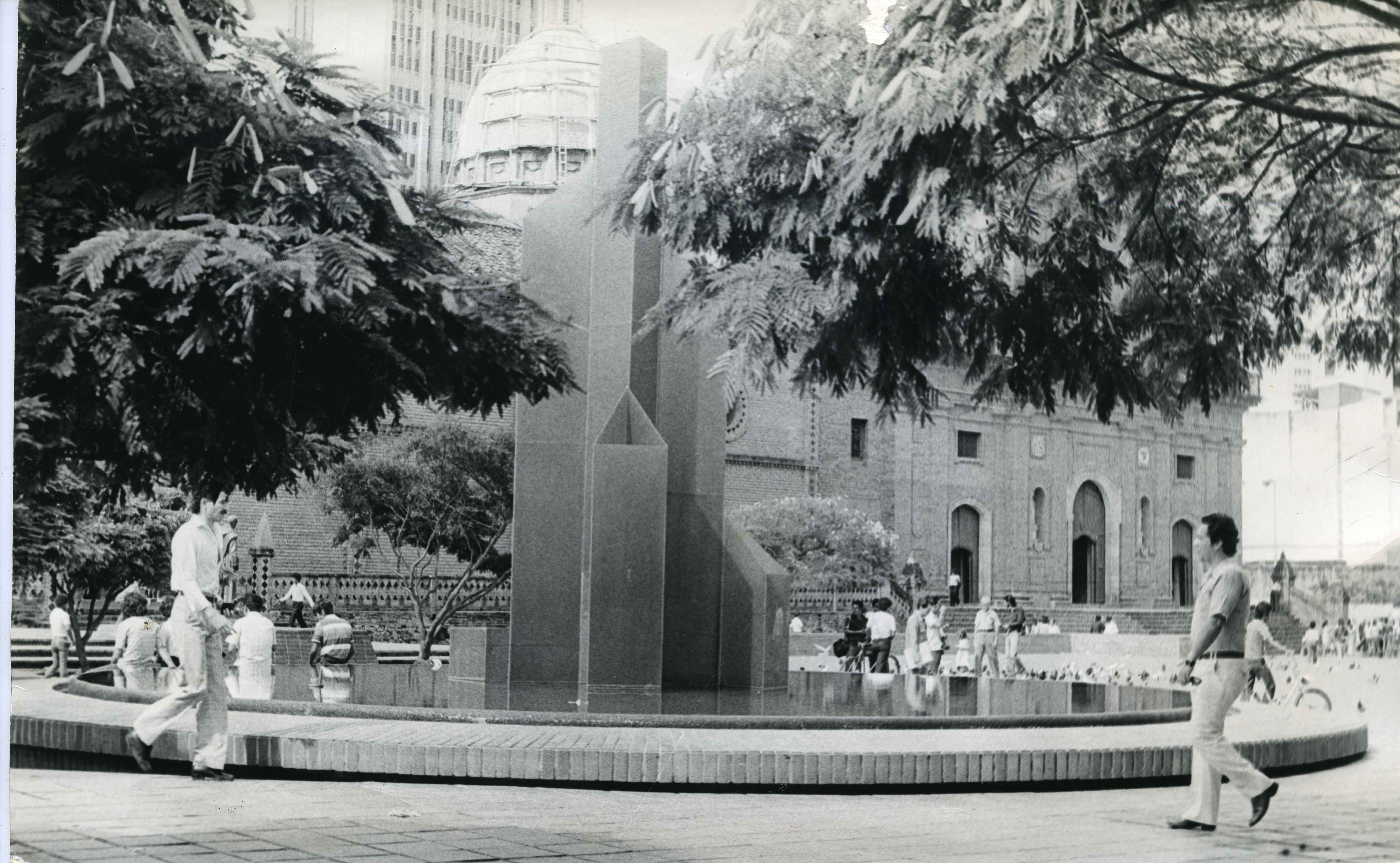 Fuente de agua en la plazoleta de San Francisco. Observamos Transeúntes y la iglesia de San Francisco // El Archivo del Patrimonio Fotográfico y Fílmico del Valle del Cauca es responsabilidad de la Biblioteca Departamental del Valle Jorge Garcés Borrero, por convenio de cooperación suscrito con la Secretaria de Cultura Departamental, con el fin de aunar esfuerzos para su conservación, preservación y divulgación del Archivo entre la comunidad Vallecaucana, especialmente entre los estudiantes e investigadores que visitan la Biblioteca, propiciando su uso y consulta permanente. La universidad Icesi es un colaborador en el proceso de difusión, facilitando la tecnología que permite la consulta de las imágenes.