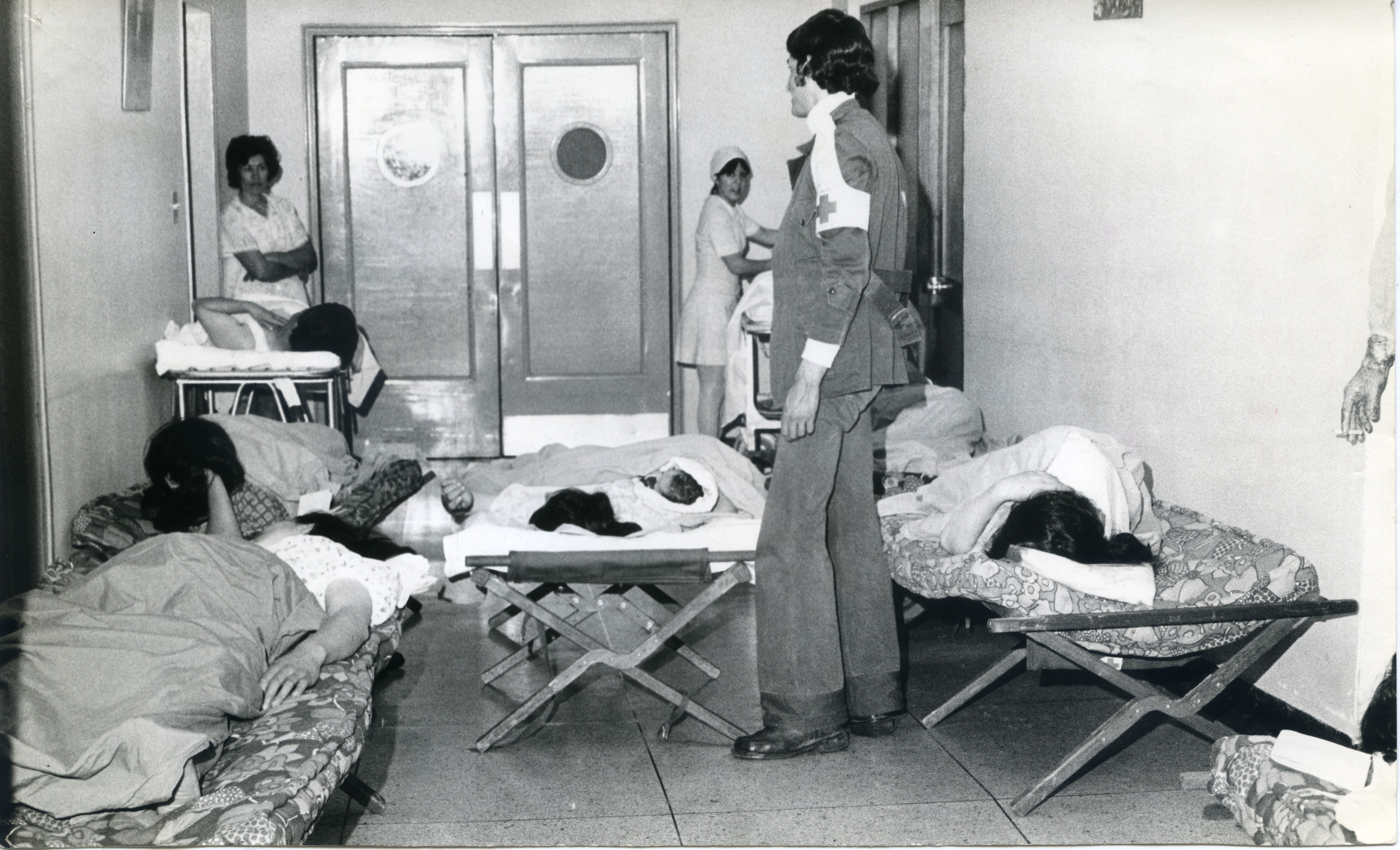 Al reverso de la fotografía se anexa el recorte.Nota manuscrita “En catres de campaña, con auxiliares de la Cruz Roja y enfermeras auxiliares, se están atendiendo los casos de maternidad en el Hospital Militar”.