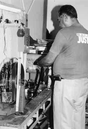 Sala de proyección de la Cinemateca de Univalle. El operador organizando la cinta, para la sigueinte función. Cali. C. 1976.
