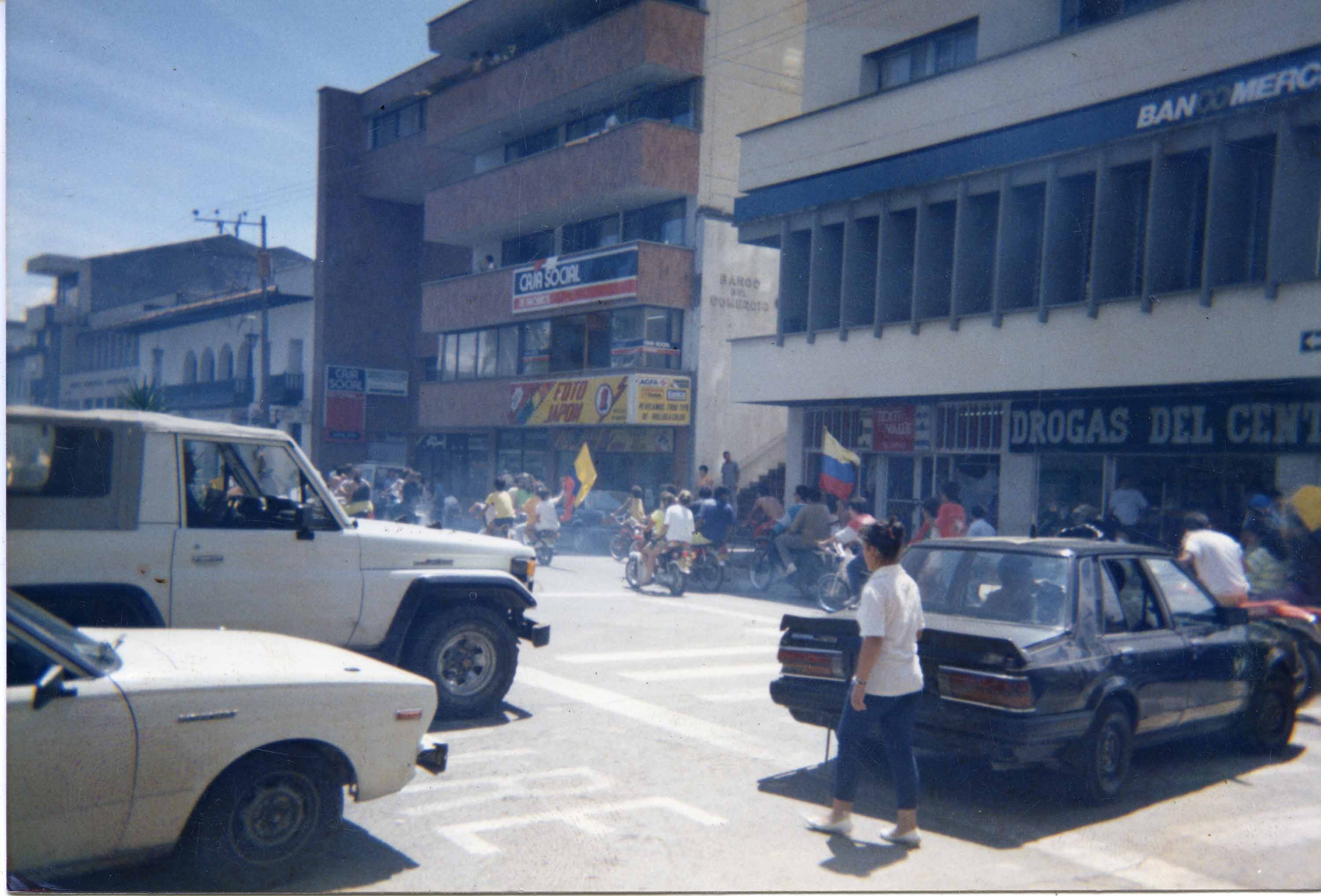 En el pie de foto dice lo siguiente: Apesar de no haber clasificado la ciudad vivió su fútbol, y los aficionados salieron a las calles con banderas de Colombia y festejarón de los lindo con maizena y agua tirada desde los pisos altos al paso de vehículos que pedían más agua para refrescarse del calor insoportable que azota al extenso Valle del Cauca.- El Archivo del Patrimonio Fotográfico y Fílmico del Valle del Cauca es responsabilidad de la Biblioteca Departamental del Valle Jorge Garcés Borrero, por convenio de cooperación suscrito con la Secretaria del Cultura Departamental, con el fin de aunar esfuerzos para su conservación, preservación y divulgación del Archivo entre la comunidad Vallecaucana, especialmente entre los estudiantes e investigadores que visitan la Biblioteca, propiciando el su uso y consulta permanente. La universidad Icesi es un colaborador en el proceso de difusión, facilitando la tecnología que permite la consulta de las imágenes.