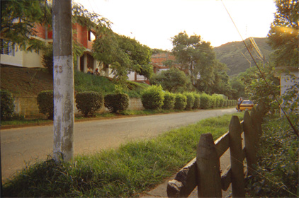 Plano general. Imagen de baranda en madera en primer plano Un taxi estacionado al fondo. Viviendas del sector ubicadas en el lado izquierdo.