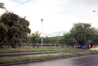 En primer plano vía. Al fondo zona verde en la cual se observa ganado pastando. Al fondo el Coliseo del Pueblo. Toma diagonal. Plano general.