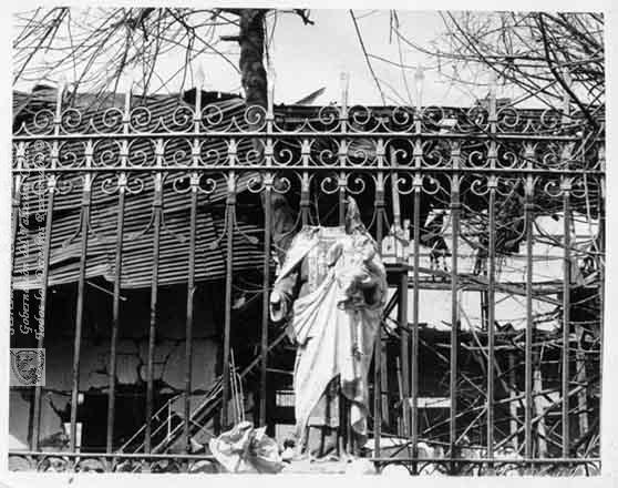 Estatua de la Virgen del Carmen, semidestruida por la explosión del 7 de agosto. Santiago de Cali, 1956.