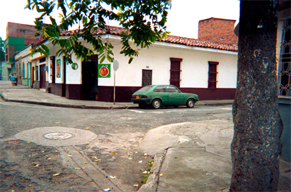 Vivienda de estilo pos colonial en la que funciona una tienda. Sobresale cartel publicitario de venta de jugos y cigarrillos instalado en la fachada. En primer plano tronco de árbol y ramas. Vehículo estacionado en la calle. Plano general.