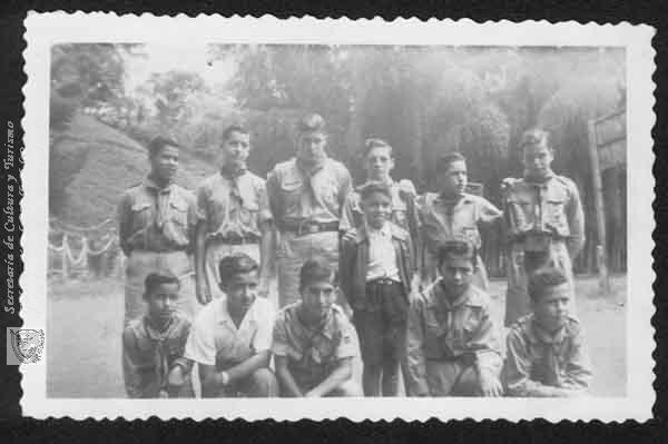 Donnald Gaiter, Alejandro Valencia, Horacio Montes, Carlos Navarro y Fabio Isaza. Integrantes del Grupo de Boy Scouts en Yanaconas, realizando actividades de entrenamiento e integración. Santiago de Cali, 1953.