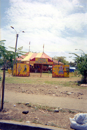 Plano general. Circo Talarita en lote del barrio. En primer plano terreno en regular estado. Arriba cielo nublado.