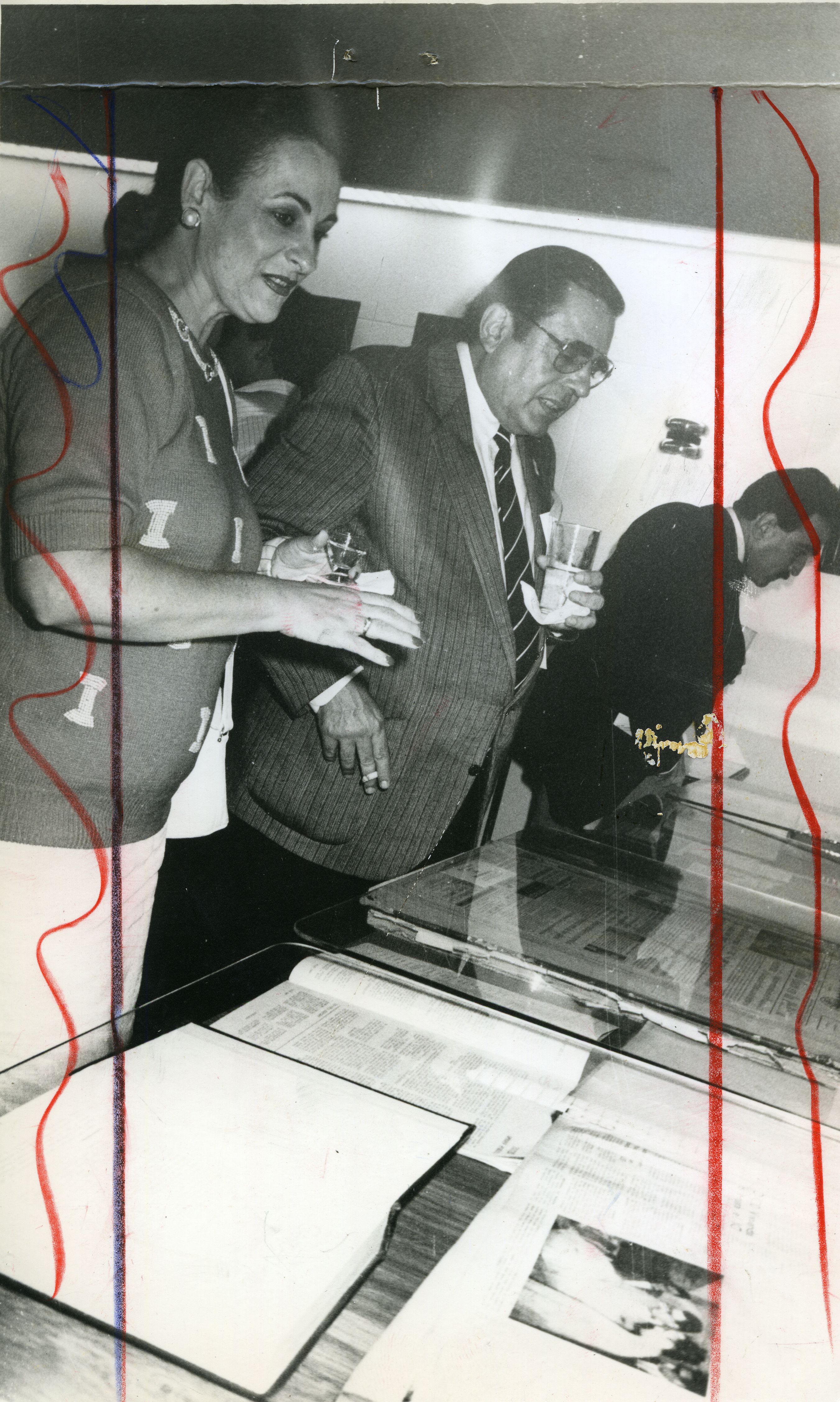 Ernesto González Caicedo, nació el 1 de febrero de 1933 en Madrid, España y murió el 16 de Febrero de 2017 en Cali Valle. Fue médico de profesión, investigador, político y criador de toros de lidia. Se casó con la Sra Alma Valencia, hija del expresidente Guillermo León Valencia. Padre de tres hijas: María del Mar González Valencia, María Fernanda González Valencia y Ximena González Valencia. Fue el fundador de la ganadería Las Mercedes en 1946, fue alcalde de Cali (1976 - 1978) y gobernador del Valle del Cauca (1988 - 1990). En el ejercicio de su carrera pública fue, además, concejal de Cali, diputado de la Asamblea del Valle, representante a la Cámara y cónsul de Colombia en los Estados Unidos. Dedicó su vida a una de sus mayores pasiones que era el estudio y la crianza del toro de lidia. En la foto, aparecen Ernesto González Caicedo y su esposa Alma Valencia de González, apreciando la exposición de periódicos que han circulado en el Valle del Cauca.