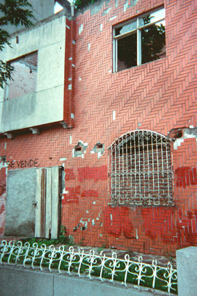 Plano medio. En la imagen se aprecia la fachada de una vivienda abandonada, con muros algo deteriorados enchapados con baldosas de color rojizo. En el extremo inferior algunas rejas de color blanco.
