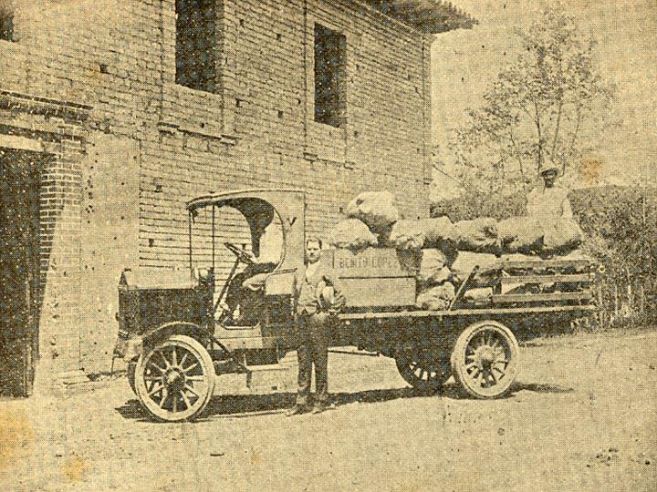 Trilladora de café "El Progreso", cuyo propietario fue Benito López.Se observa en la fotografía un empleado de la trilladora llevando los bultos de café hasta el vehículo para su posterior comercialización. Santiago de Cali, 1920.