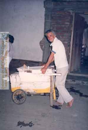 El señor Gilberto fue el primer vendedor de "Cremas" del pueblo. Los cremeros como popularmente se les conoce llevan en sus carrtios las delicias de niños y niñas con este tipo de helado. Guacarí. 1991.