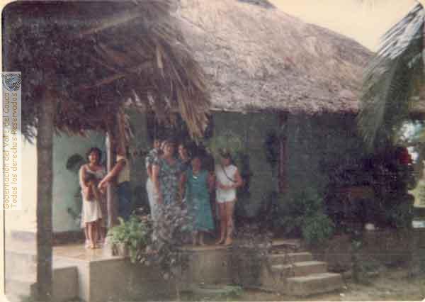 ALVARO VICTORIA (1980). Hermosa construcción en bahareque y techo de paja bajo cuya sombra se refrescan Lucila Umaña, Norha Victoria, Nhora Gómez y Ana María Villegas de visita en la Finca Daza & 602026. ZARZAL: Biblioteca Departamental Jorge Garces Borrero.