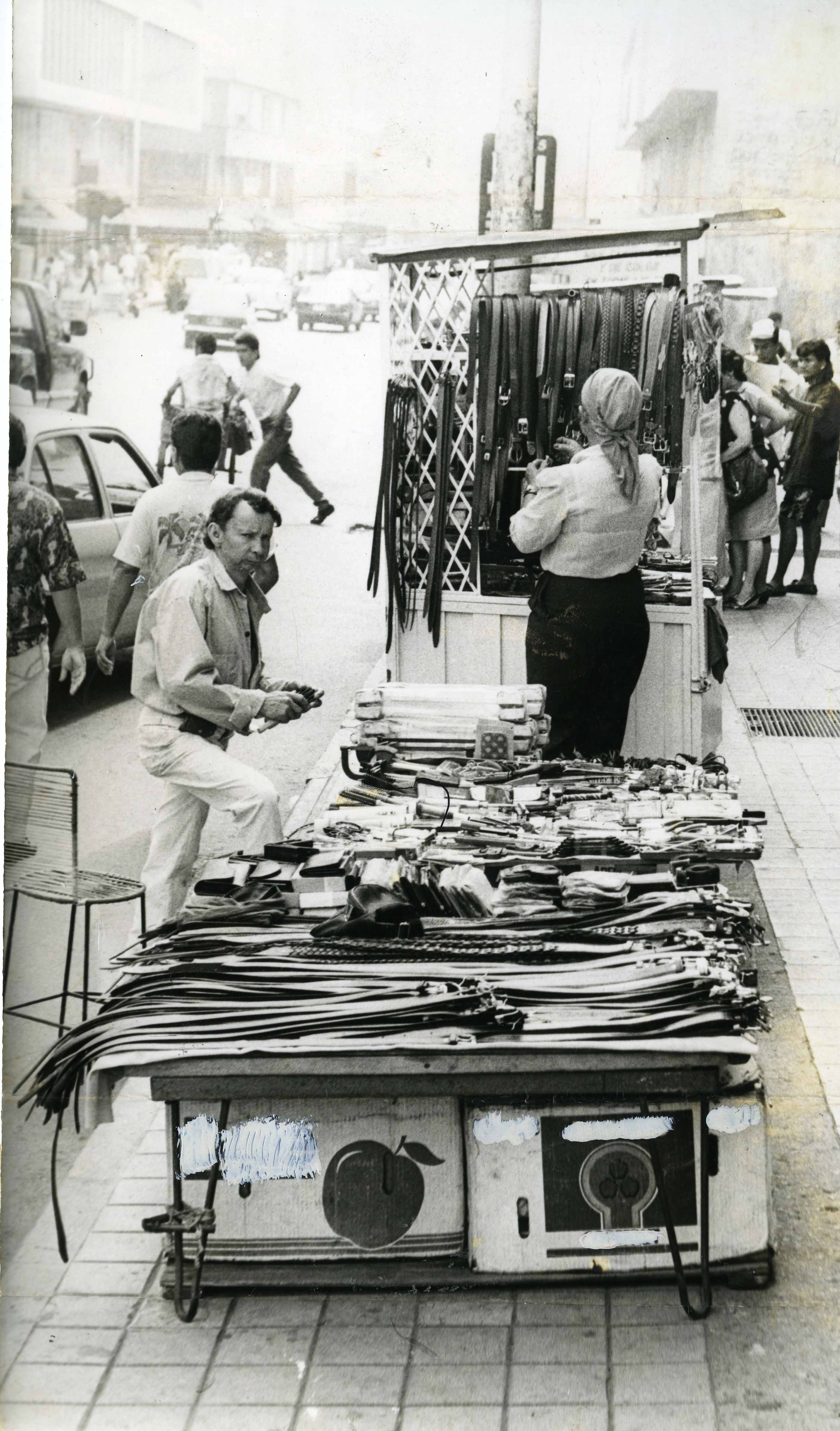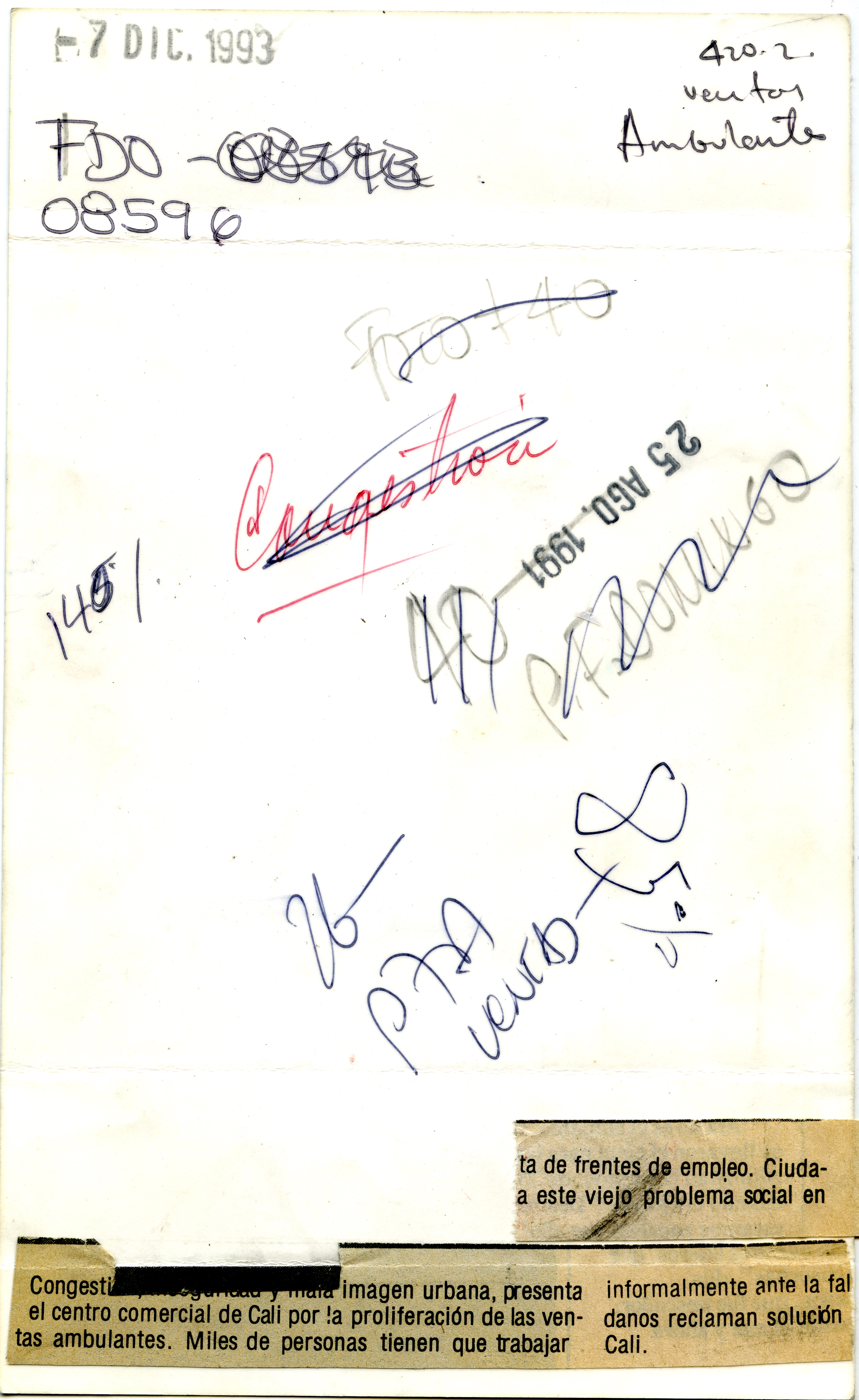 Al reverso de la fotografía se anexa recorte: "Congestión, inseguridad y mala imagen urbana, presenta el Centro Comercial de Cali por la proliferación de las ventas ambulantes. Miles de personas tienen que trabajar informalmente ante la falta de fuentes de empleo. Ciudadanos reclaman solución a este viejo problema social en Cali."